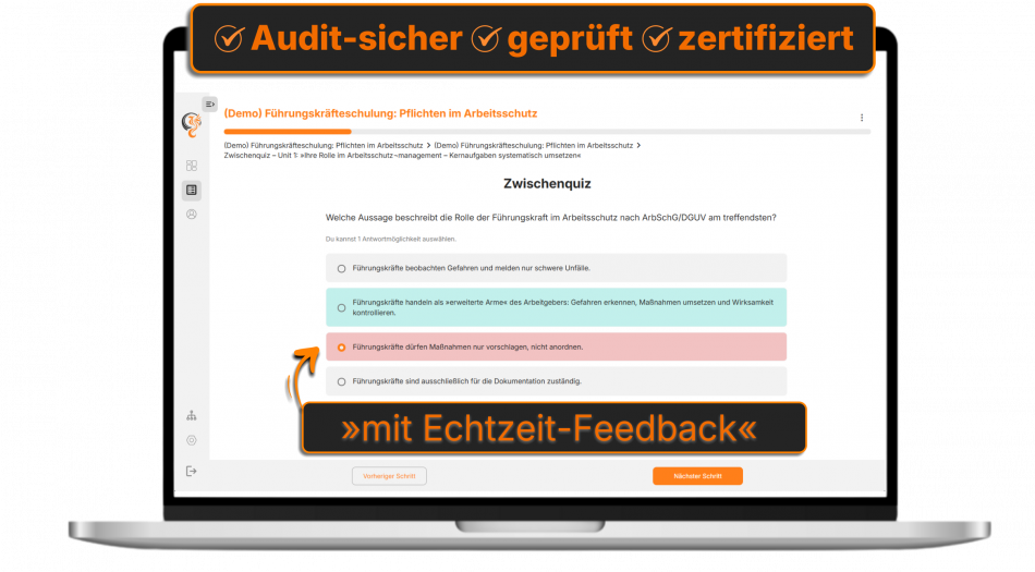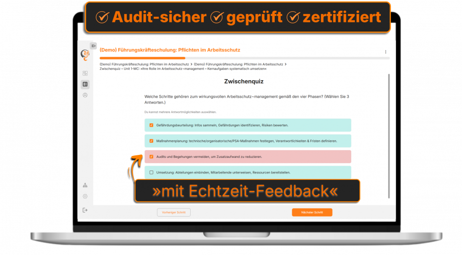 - Abschluss-/Wissenschecks wirken durch adaptive Fragenlogik